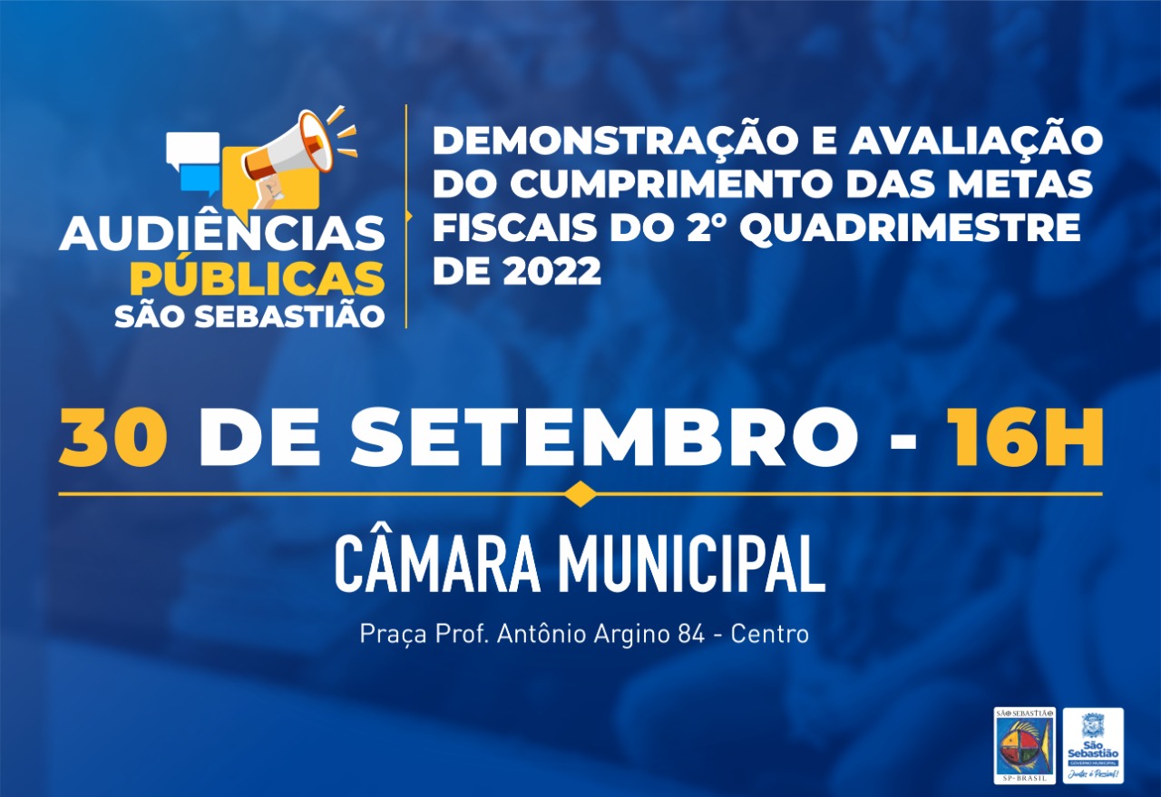 A Prefeitura de São Sebastião, por meio da Secretaria da Fazenda (SEFAZ), informa que no dia 30 de setembro, às 16h, ocorre a audiência pública para demonstração e avaliação do cumprimento das metas fiscais do segundo quadrimestre de 2022 referentes à Lei Orçamentária Anual (LOA).