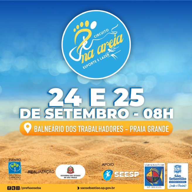 A Secretaria de Esportes do Governo do Estado de São Paulo, com parceria da Prefeitura de São Sebastião, por meio da Secretaria de Esportes (SEESP), realizará o Circuito Pé na Areia, nos dias 24 e 25 de setembro, evento que é um programa de incentivo ao esporte e cultura do Estado.