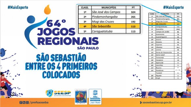 ParaTodosVerem: arte institucional com tabela da classificação geral do 64º Jogos Regionais, uma das principais competições esportivas do Estado de São Paulo, que a cidade de São Sebastião terminou com a quarta colocação, somando 113 pontos. Fim da descrição.