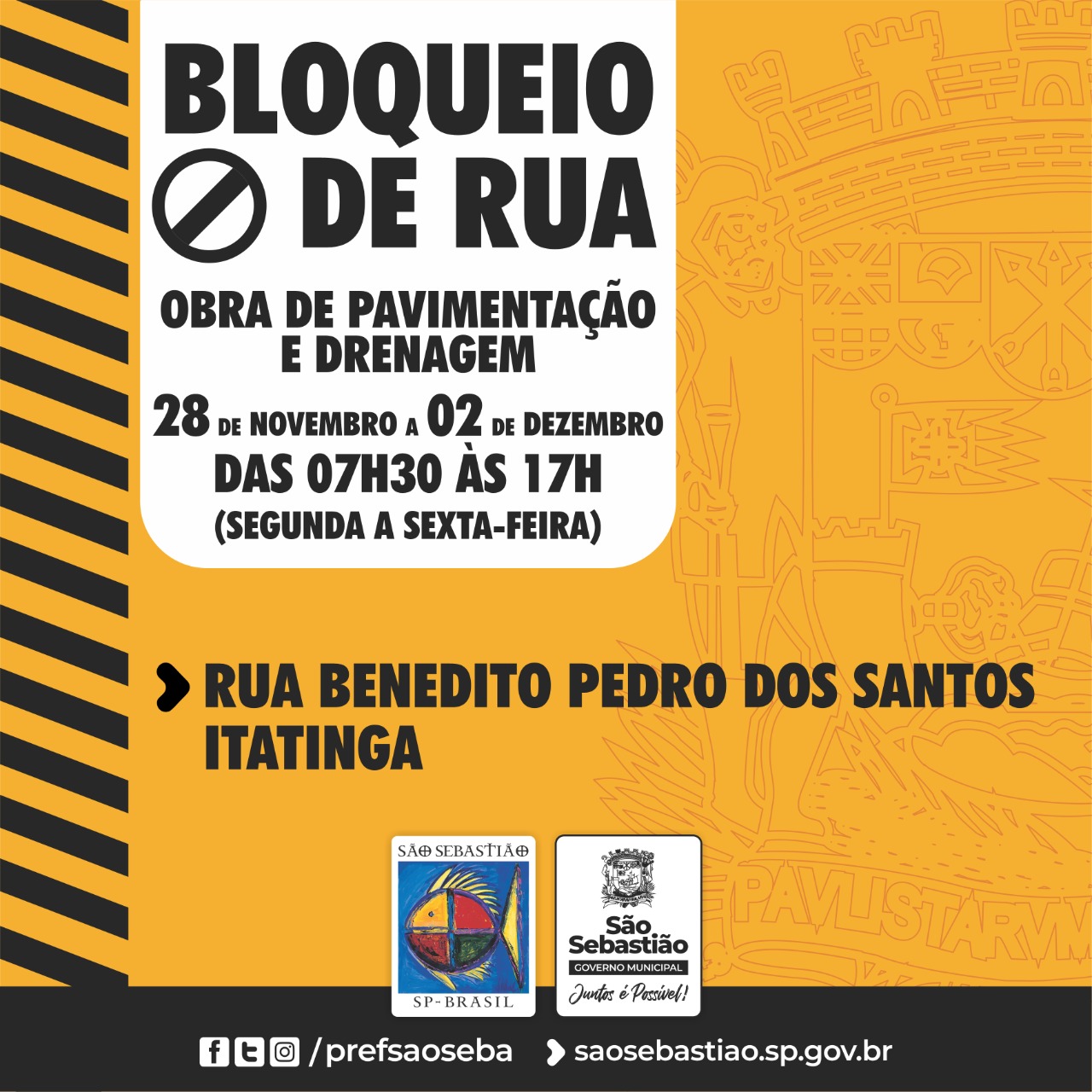 A Prefeitura de São Sebastião, por meio da Secretaria de Obras (SEO), informa que a Rua Benedito Pedro dos Santos, no bairro Itatinga, região central, estará interditada a partir do dia 28 de novembro, devido à realização das obras de drenagem e pavimentação. A interdição ocorrerá de 28 de novembro ao dia 02 de dezembro, das 07h30 às 17h.
