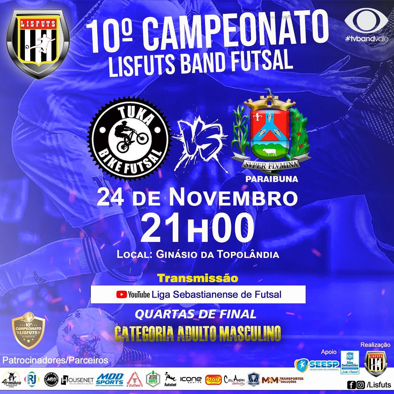 #ParaTodosVerem: arte institucional com informações das partidas desta quinta-feira (24) do 10º Campeonato Lisfuts Band Futsal que é organizado Liga Sebastianense de Futsal com apoio da Prefeitura de São Sebastião e por meio da Secretaria de Esportes (SEESP). Fim da descrição.