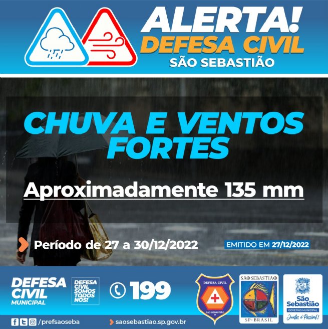 A Prefeitura de São Sebastião, por meio da Defesa Civil, vinculada à Secretaria de Segurança Urbana (SEGUR), emitiu alerta de riscos meteorológicos entre hoje (27) e sexta-feira (30).