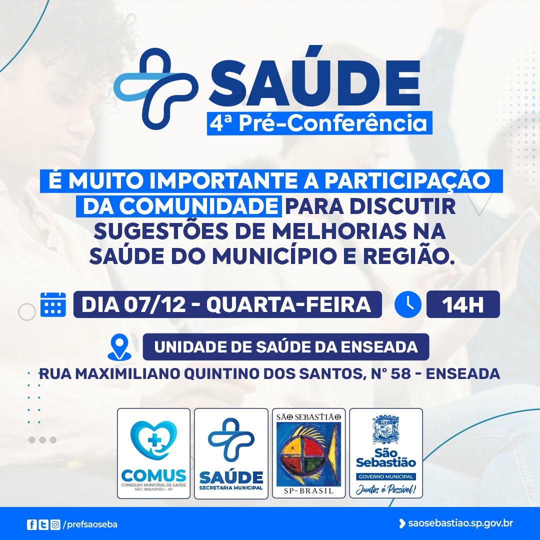 A Prefeitura de São Sebastião, por meio da Secretaria de Saúde (SESAU), em conjunto com o Conselho Municipal de Saúde (COMUS), realizará, nesta quarta-feira (7), a quarta de seis pré-conferências da Saúde, a fim de ouvir sugestões da população de melhorias para a área. A reunião acontecerá às 14h na Unidade Básica de Saúde (UBS), à Rua Maximiliano dos Santos, n.º 38, na Enseada.