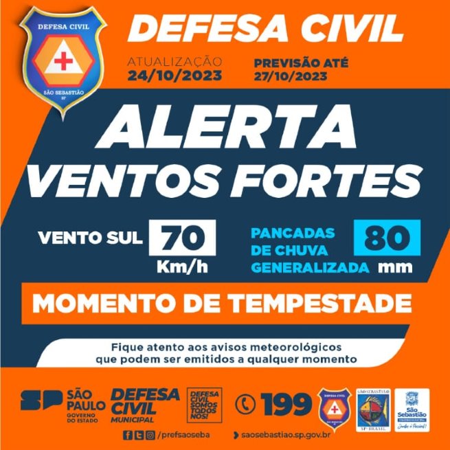 A Defesa Civil de São Sebastião alerta para o deslocamento de uma frente fria localizada sobre o oceano que deve contribuir para a ocorrência de pancadas de chuva de até 80 milímetros que podem estar acompanhadas de rajadas de vento de até 70 km/h, raios e até mesmo granizo em alguns pontos.