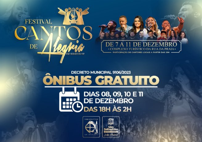 O transporte coletivo urbano de passageiros, de São Sebastião, será gratuito, entre esta sexta-feira (8) e segunda-feira (11), a partir das 18h até às 2h do dia seguinte, durante a realização dos shows do Festival Cantos da Alegria.