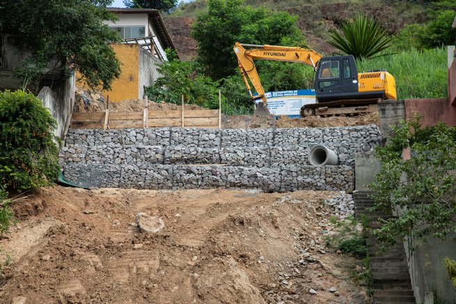 A obra de contenção de talude com gabião realizada na Rua Quinze de Novembro, no bairro Pontal da Cruz, na região central de São Sebastião, já está com cerca de 70% de execução e entra em fase de finalização. A obra inclui a conclusão da pavimentação da via.