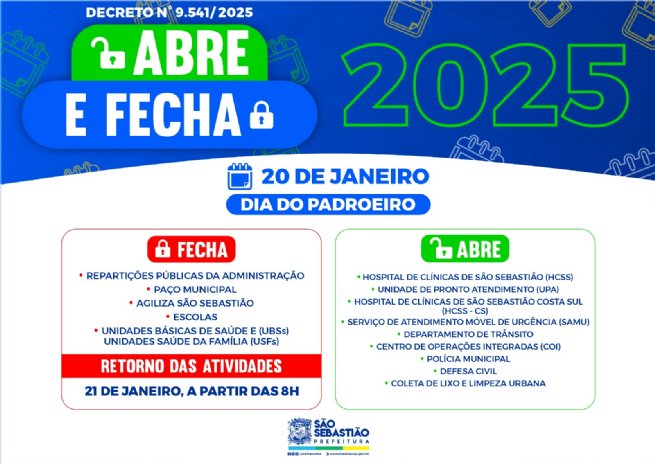 Os serviços oferecidos pela Prefeitura de São Sebastião terão funcionamento diferenciado na segunda-feira (20), Dia de São Sebastião, Padroeiro da cidade, conforme o Decreto Municipal 9.541/2025. Com isso, algumas repartições públicas não funcionarão. Outros serviços, considerados essenciais, funcionam em regime de plantão. O atendimento normal retorna na terça-feira (21).