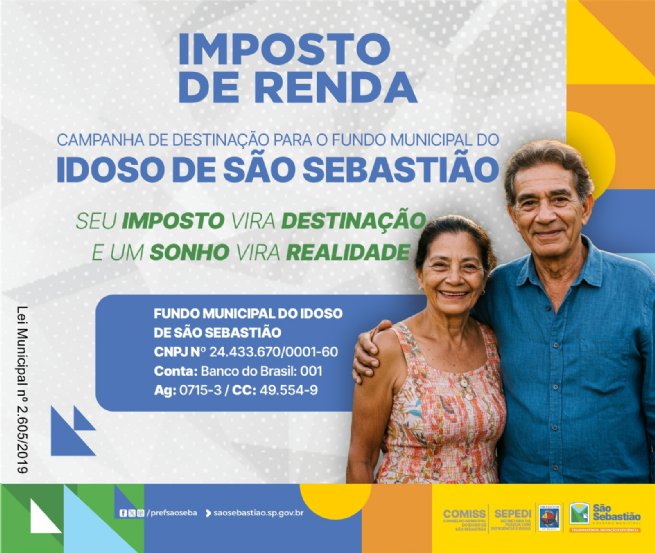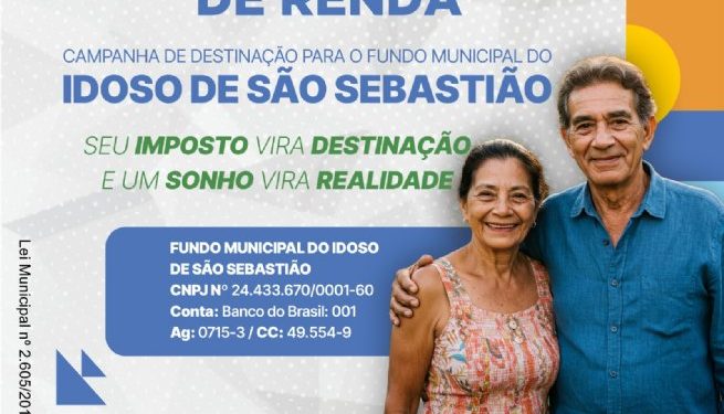 A campanha é a destinada ao Fundo Municipal do Idoso de São Sebastião, no momento da entrega da Declaração de Imposto de Renda Pessoa Física, limitada a 3% do valor do imposto de Renda Devido, através de DARF gerada na própria Declaração e paga até o último dia útil da entrega que neste ano será 30 de maio.