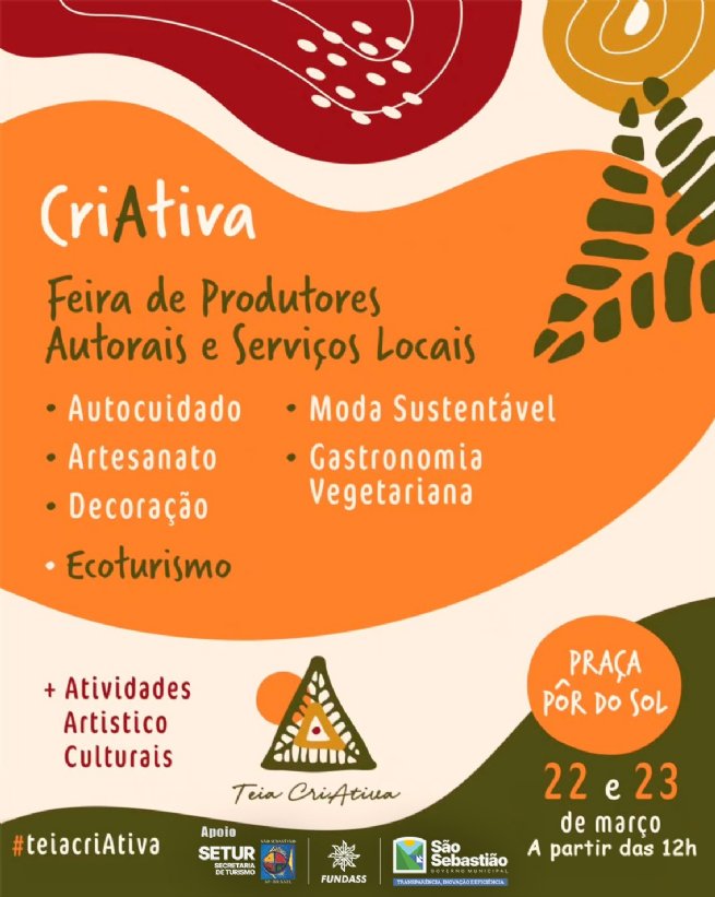 Neste fim de semana, dias 22 e 23 de março, a partir das 12h, a Praça Pôr do Sol, na praia de Boiçucanga, será palco da Feira CriAtiva – um evento que celebra a gastronomia local, a arte e a produção artesanal em São Sebastião.
