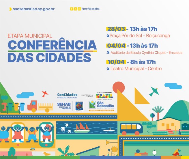 ‘A importância da Habitação em São Sebastião’ e ‘O que é Regularização Fundiária. Quais os desafios para São Sebastião’ são os principais temas a serem explanados no primeiro dia da Etapa Municipal da Conferência das Cidades que será realizada na sexta-feira (28/3) na Praça Pôr do Sol, em Boiçucanga, na Costa Sul do município, das 13h às 17h.