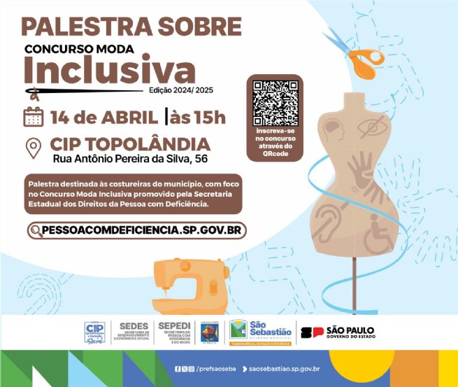 A Prefeitura de São Sebastião, por meio das secretarias da Pessoa com Deficiência e do Idoso (Sepedi) e de Desenvolvimento Econômico e Social (Sedes), realiza na próxima segunda-feira (14/4) uma palestra sobre o Concurso Moda Inclusiva, promovido anualmente pela Secretaria de Estado dos Direitos da Pessoa com Deficiência.