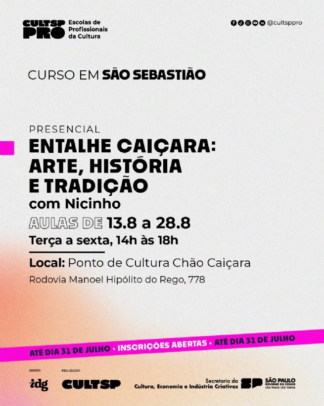 Inscrições: até 31 de julho, por meio do link www.cultsppro.org.br/br/cursos/mapa-de-cursos/entalhe-cai%C3%A7ara-arte-hist%C3%B3ria-e-tradi%C3%A7%C3%A3o.