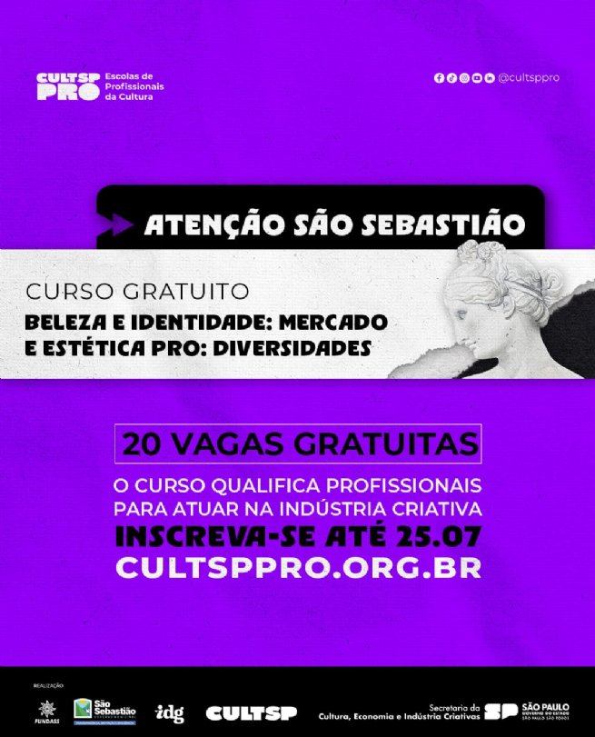 O CULTSP PRO – Escolas de Profissionais da Cultura, programa da Secretaria da Cultura, Economia e Indústria Criativas do Estado de São Paulo, lança em parceria com a Fundação Educacional e Cultural ‘Deodato Sant’Anna’ (Fundass), o curso gratuito ‘Beleza e Identidade: Mercado e Estética pro: diversidades’, voltado à qualificação de profissionais da indústria criativa com foco em expressões culturais performáticas. As inscrições serão realizadas de forma on-line, de 15 a 25 de julho, por meio do site www.cultsppro.org.br/br/inscricoes.