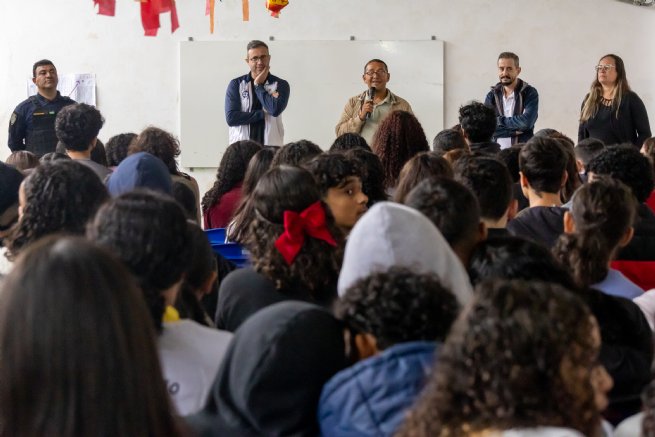 Também participou o comandante Evandro Batista, da Guarda Mirim de São Sebastião, que trouxe reflexões importantes sobre segurança pública no ambiente escolar. Ele reforçou a importância do respeito mútuo, do cuidado com os colegas e da responsabilidade compartilhada para prevenir situações de risco e fortalecer a convivência saudável.