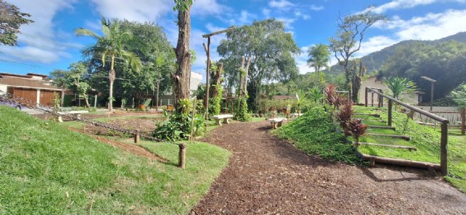 #PraTodosVerem: As imagens mostram diferentes ângulos da nova Praça Renascer, no bairro de Juquehy, em São Sebastião. O espaço revitalizado conta com trilhas de madeira triturada, bancos de concreto, brinquedos de madeira para crianças, áreas verdes com paisagismo, escorregadores naturais com cobertura vegetal e estrutura de cordas, além de iluminação pública com postes de LED. Também é possível ver bandeirinhas coloridas enfeitando a praça para a inauguração com arraial, além de lixeiras ecológicas, sinalização e um sistema de monitoramento 24h. Ao fundo, nota-se a presença do rio desobstruído e cercado por vegetação nativa.