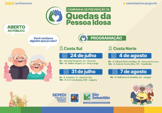 A Prefeitura de São Sebastião, por meio da Secretaria da Pessoa com Deficiência e do Idoso (Sepedi), promove a Campanha de Prevenção de Quedas da Pessoa Idosa, a partir de 24 de julho nos bairros da Costa Sul e região Central de São Sebastião. O objetivo é informar, conscientizar e alertar o público idoso sobre a importância dos cuidados necessários para prevenção de quedas, frequentes nessa faixa etária.
