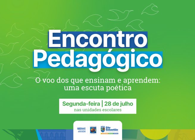 #PraTodosVerem: arte gráfica com fundo verde, decorado com silhuetas de pássaros em voo, em tons suaves. Ao centro, está escrito “Encontro Pedagógico” em letras grandes e brancas com sombra azul. Abaixo, em branco, o tema do encontro: “O voo dos que ensinam e aprendem: uma escuta poética”. Em destaque, um retângulo branco informa: “Segunda-feira | 28 de julho”, seguido da frase “nas unidades escolares”. Na parte inferior, aparecem os logos da Secretaria da Educação, do Governo Municipal de São Sebastião e o brasão da cidade. Em seguida, fotos ilustrativas de professores em diferentes escolas sentados em carteiras e mesa de reunião observando a secretária da Educação Marta Braz falando. Fim da descrição.