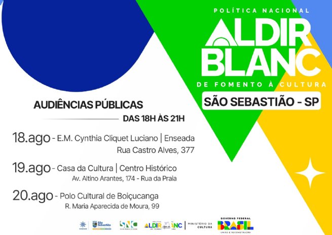 A Prefeitura de São Sebastião, por meio da Fundação Educacional e Cultural ‘Deodato Sant’Anna’ (Fundass), em parceria com o Conselho Municipal de Cultura (CMCS-SS), convida todos os artistas, produtores e fazedores de cultura do município a participarem da consulta pública sobre a aplicação dos recursos da Política Nacional Aldir Blanc de Fomento à Cultura (PNAB) – Ciclo 2.