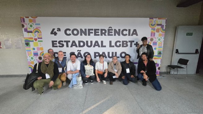 #PraTodosVerem: um grupo de pessoas posa sorridente em frente a um painel escrito “4ª Conferência Estadual LGBT+ de São Paulo”. Todos estão agachados ou em pé, lado a lado. O painel tem cores e símbolos representando a diversidade. Fim da descrição.