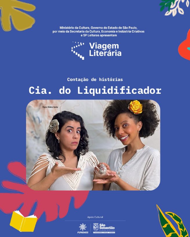 #PraTodosVerem: cartaz colorido do projeto Viagem Literária. Na imagem, duas mulheres sorridentes seguram um objeto. No texto, anúncio da contação de histórias da “Cia. do Liquidificador”, no dia 13 de agosto, às 9h e às 14h, na Biblioteca Municipal Álvaro Doria Orselli – Seu Alvinho, em São Sebastião. Evento gratuito e acessível em Libras. Fim da descrição.