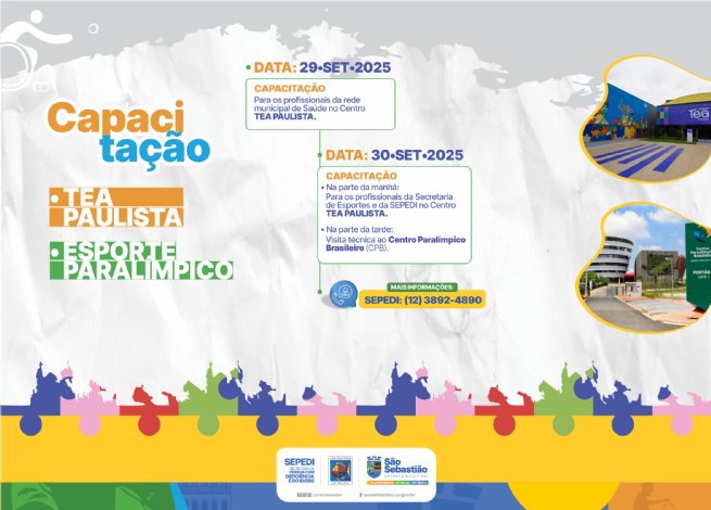A Prefeitura de São Sebastião, por meio da Secretaria da Pessoa com Deficiência e do Idoso (Sepedi), promove nos dias 29 e 30 de setembro, a capacitação ‘Transtorno do Espectro Autista (TEA)’ voltado aos profissionais das Secretarias de Saúde (Sesau), de Esportes (Seesp), da Sepedi e da Sedes. A ação será no Centro Transtorno Espectro Autista (TEA) Paulista, na capital.