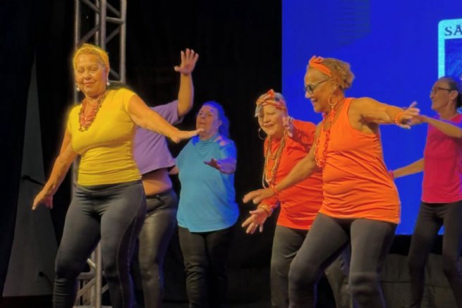 #PraTodosVerem: Imagens de mulheres idosas, felizes e dançando em cima do palco  e a imagem seguinte mais de longe retratando o público prestigiando a apresentação dessas mesmas mulheres. Fim da Descrição.