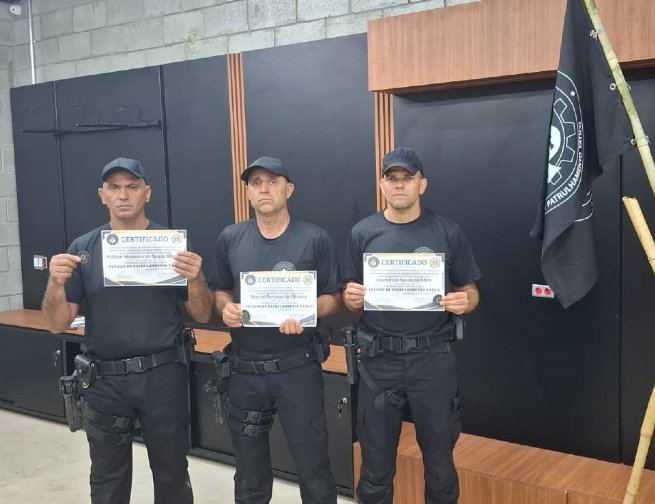 #PraTodosVerem: As imagens mostram agentes da Guarda Civil Municipal durante curso de formação e capacitação. Na primeira foto, três guardas posam lado a lado em ambiente interno, segurando certificados de conclusão e usando uniforme preto com boné. Na segunda imagem, um grupo de agentes posa em área externa, formando duas fileiras, com alguns segurando bandeiras com os brasões dos cursos “E.P.T.” e “PATAMO”. Ao fundo, há árvores e um terreno gramado. Na terceira foto, três agentes posam ao ar livre, um deles segurando uma bandeira preta com o logotipo “E.P.T.”, em frente a um carro e uma área arborizada. Fim da descrição.