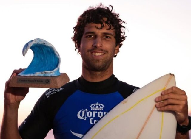 #PraTodosVerem: As imagens mostram surfistas deslizando por dentro de tubos cristalinos ao entardecer, com ondas verdes iluminadas pela luz baixa e borrifos brilhando contra o horizonte, enquanto ao final um atleta, ainda com a lycra de competição e segurando sua prancha, posa sorridente em frente ao mar segurando um troféu em formato de onda, celebrando sua performance no campeonato. Fim da descrição.