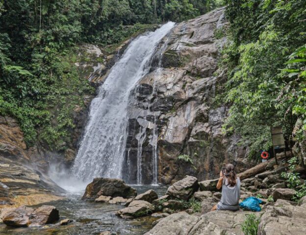 #PraTodosVerem: A primeira imagem mostra uma mulher de costas, sentada em rochas, fotografando uma imponente cachoeira que desce por um paredão de pedra em meio a uma densa e preservada vegetação verde. A segunda destaca um pássaro saíra-sete-cores de plumagem vibrante em tons de azul e amarelo olhando para cima. Fim da descrição.