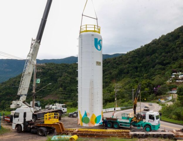#PraTodosVerem: Sequência de três fotos registra a instalação de um grande reservatório metálico cilíndrico branco da Sabesp em uma área de encosta. Nas imagens, guindastes e caminhões articulados operam às margens de uma rodovia sinuosa para erguer a estrutura, que possui detalhes coloridos na base e uma escada amarela no topo. O cenário é composto por vegetação densa de Mata Atlântica sob um céu nublado, destacando o trabalho de engenharia para o abastecimento de água na região. Fim da descrição.