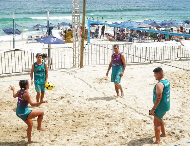 #PraTodosVerem: Esta série de imagens captura a energia vibrante de uma competição de futevôlei em uma praia movimentada, repleta de espectadores e guarda-sóis. Atletas demonstram habilidade e concentração em diferentes momentos do jogo, como um jogador chutando acrobaticamente a bola sobre a rede, uma jogadora se preparando para um passe e outra atleta observando atentamente a trajetória da bola cabeceada por seu parceiro. Fim da descrição.