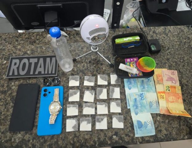 Durante a abordagem e busca pessoal, foram localizadas com R.S.S., 26 anos, 16 porções de cocaína, três porções de maconha, além de uma pequena quantidade de lança-perfume e R$ 370 em espécie. Segundo a Polícia Municipal, a forma de acondicionamento das drogas e a quantia em dinheiro reforçaram os indícios de tráfico, resultando na prisão em flagrante de R.S.S. Um celular e uma motocicleta também foram apreendidos para investigação.