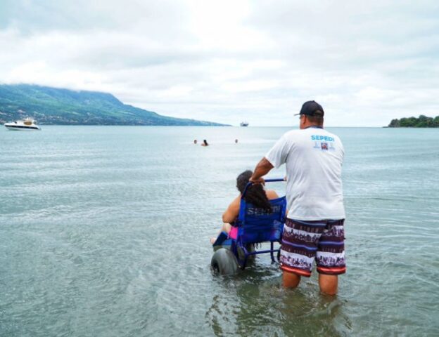 #PraTodosVerem: Sequência de fotos mostra o uso de cadeiras de rodas anfíbias em uma praia com montanhas ao fundo. Nas imagens, um homem de camiseta branca e boné conduz as cadeiras, que possuem rodas grandes e azuis, facilitando o deslocamento na areia e na água. Em uma das fotos, uma mulher de biquíni rosa é levada ao mar com o auxílio de um guarda-vidas; em outra, um homem sentado na cadeira sorri e faz um sinal de “joinha” na beira d’água. Fim da descrição.