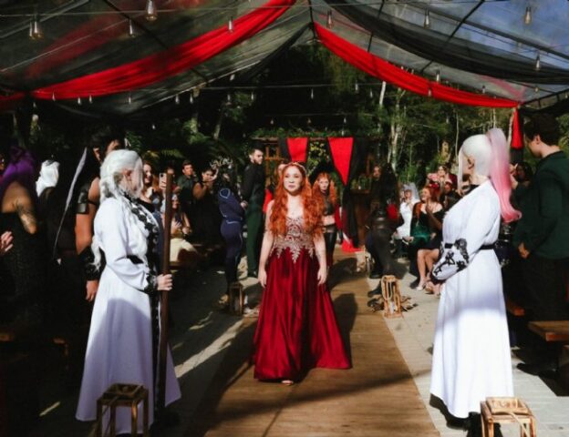 #PraTodosVerem: Imagens de evento temático de fantasia medieval. Grupo de pessoas caracterizadas posa em frente a cenário com bandeiras vermelhas; ao centro, mulher com vestido longo vermelho, com público ao redor e decoração em vermelho e preto. Capa de livro de fantasia, com personagem destacada. Fim da descrição
