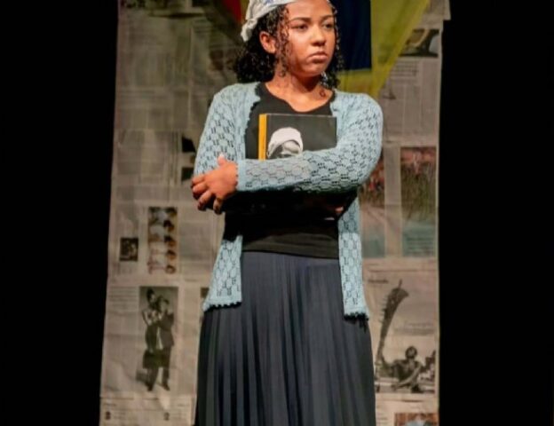 #PraTodosVerem: Este conjunto de quatro imagens retrata jovens envolvidos em atividades culturais e educativas relacionadas à ancestralidade e ao cotidiano. Três das fotos mostram cenas de uma peça de teatro em um palco simples, com painéis de jornal ao fundo, onde jovens negros encenam momentos distintos: uma interação entre três atrizes, um rapaz vestido de médico atendendo uma colega, e uma jovem segurando um livro contra o peito com uma expressão reflexiva. A quarta imagem foca no ambiente escolar, mostrando três estudantes, dois rapazes e uma moça concentrados na leitura conjunta de um livro colorido intitulado ‘TAYNÔH’, sugerindo um momento de aprendizado e valorização literária.Fim da descrição.
